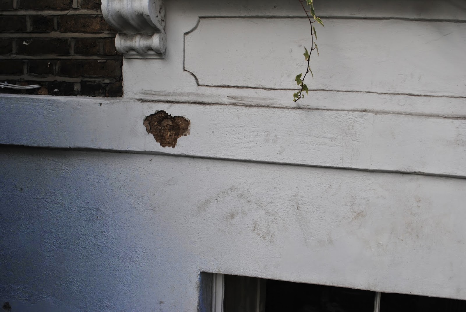 I hacked off the existing cement render and look what I found.We rendered the brickwork with a Roman cement mix and re ran the string course moulding and here are the results